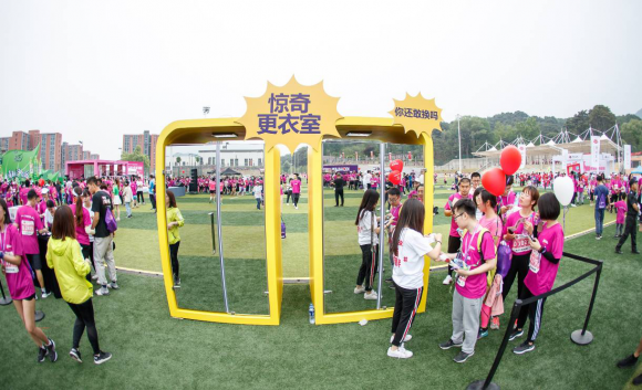 迷你马终点是一场欢乐与爱的派对。在梦幻泡泡秀的表演中,家庭守护者“大白”等候在终点,用爱的拥抱迎接每一位完赛的跑者,也开启了赛后的趣味互动。冲过终点线,马上换下汗透的衣服是跑者最大的需求。科勒利用单向透视玻璃打造的“惊奇更衣室”,可以在科勒产品的安全陪伴下,边更衣边看外界的热闹,同时感受科勒产品带来的徐徐凉风。