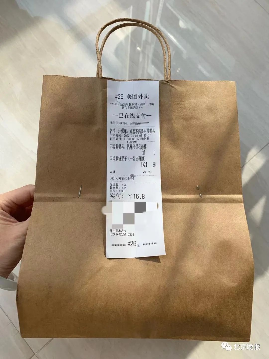 昨天中午,记者分别在犟骨头(航天桥食宝街店)、桃爷新疆米粉(花园桥店)、内蒙铁锅焖面(航天桥店)、8087黄焖鸡米饭(花园桥店)和早乐·品致早餐煎饼·油条·豆腐脑(车道沟店),下单购买外卖食品。当5份外卖陆续送达时,记者发现,竟然只有早乐·品致早餐店出售的两套煎饼被3个订书钉密封在纸袋内。