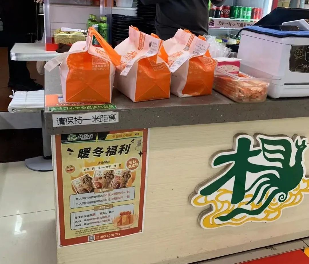 美食广场提供外卖送餐服务的各家店铺,牛哇塞筋头巴脑牛杂煲、杨国福麻辣烫等店铺已采用带提手的纸袋或是小型购物袋作为外卖包装袋,订书钉成了服务员打包的标配。