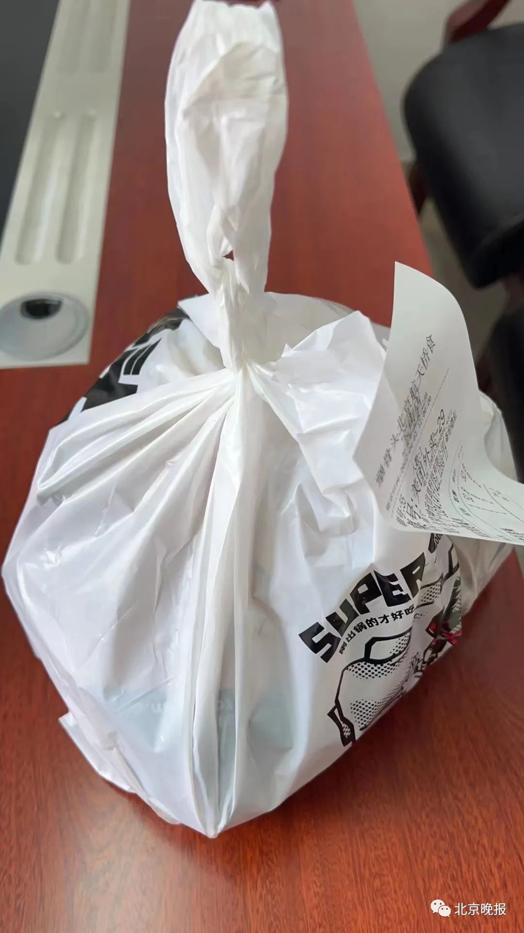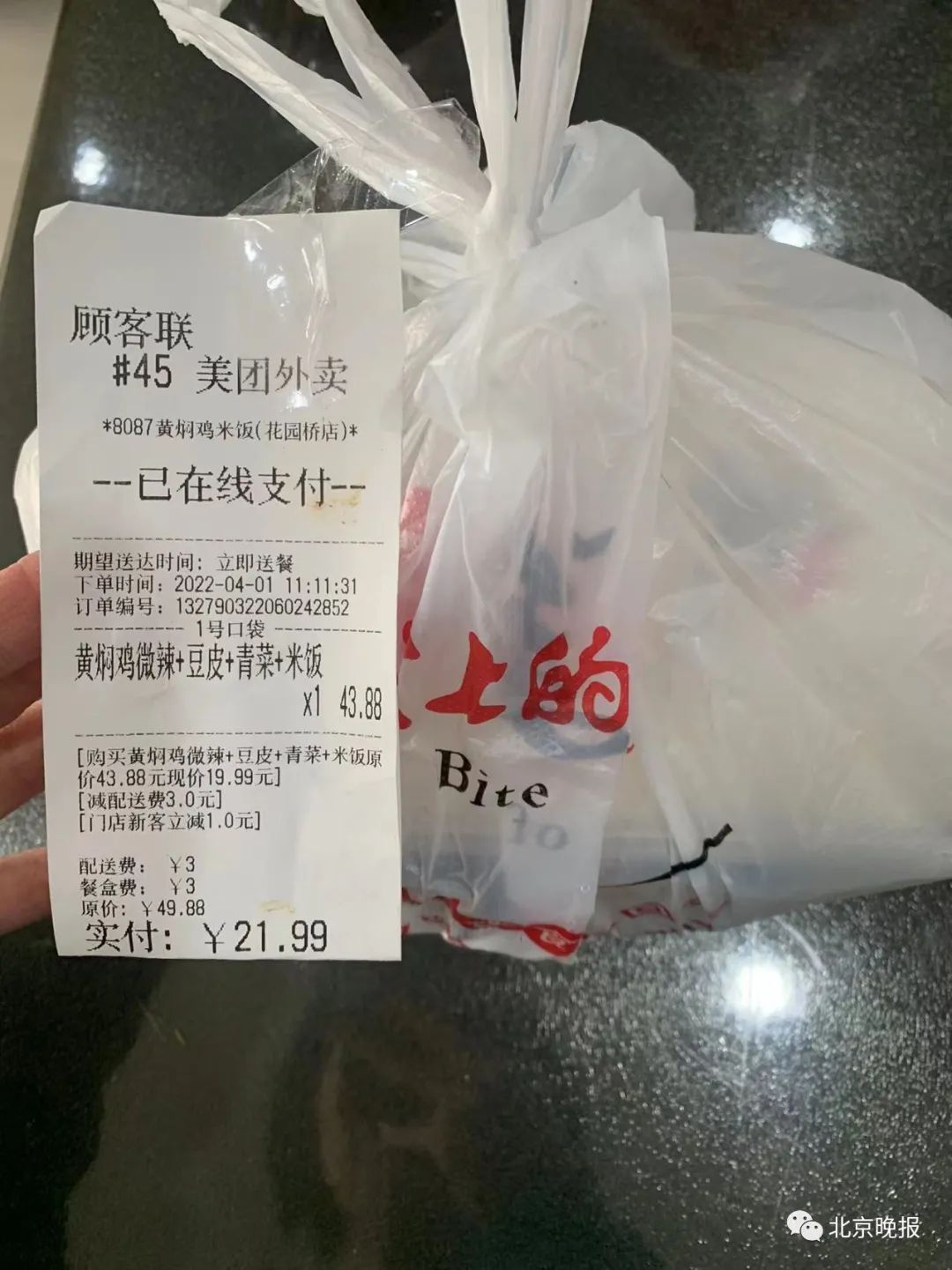 杨铭宇黄焖鸡米饭店铺的柜台内,整齐摆放着成摞的牛皮纸手提袋,服务员将外卖装入袋子后,会立刻在袋子的封口处钉上3枚订书钉,对外卖进行密封。