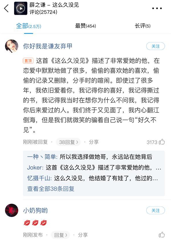 《这么久没见》是薛之谦新专辑《尘》的第三主打,歌曲完美展现了薛之谦舒缓有力的低音,把爱情中的挣扎与矛盾展现的淋漓尽致,“薛氏情歌”魅力依旧,难怪在酷狗一上线就收获2万+的热评。