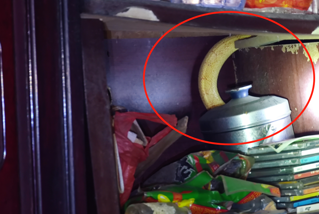 经过认真细致的查找,警辅人员终于在张女士客厅墙角一张闲置的茶几内,发现了一个黄色的蛇脑袋。 手电筒一照,此时这条黄色的大蛇似乎感知到人类的存在,扭动下露出了它藏在杂物后那腕口粗的身体,而它的嘴里正朝外吐着红色的“蛇信子”。