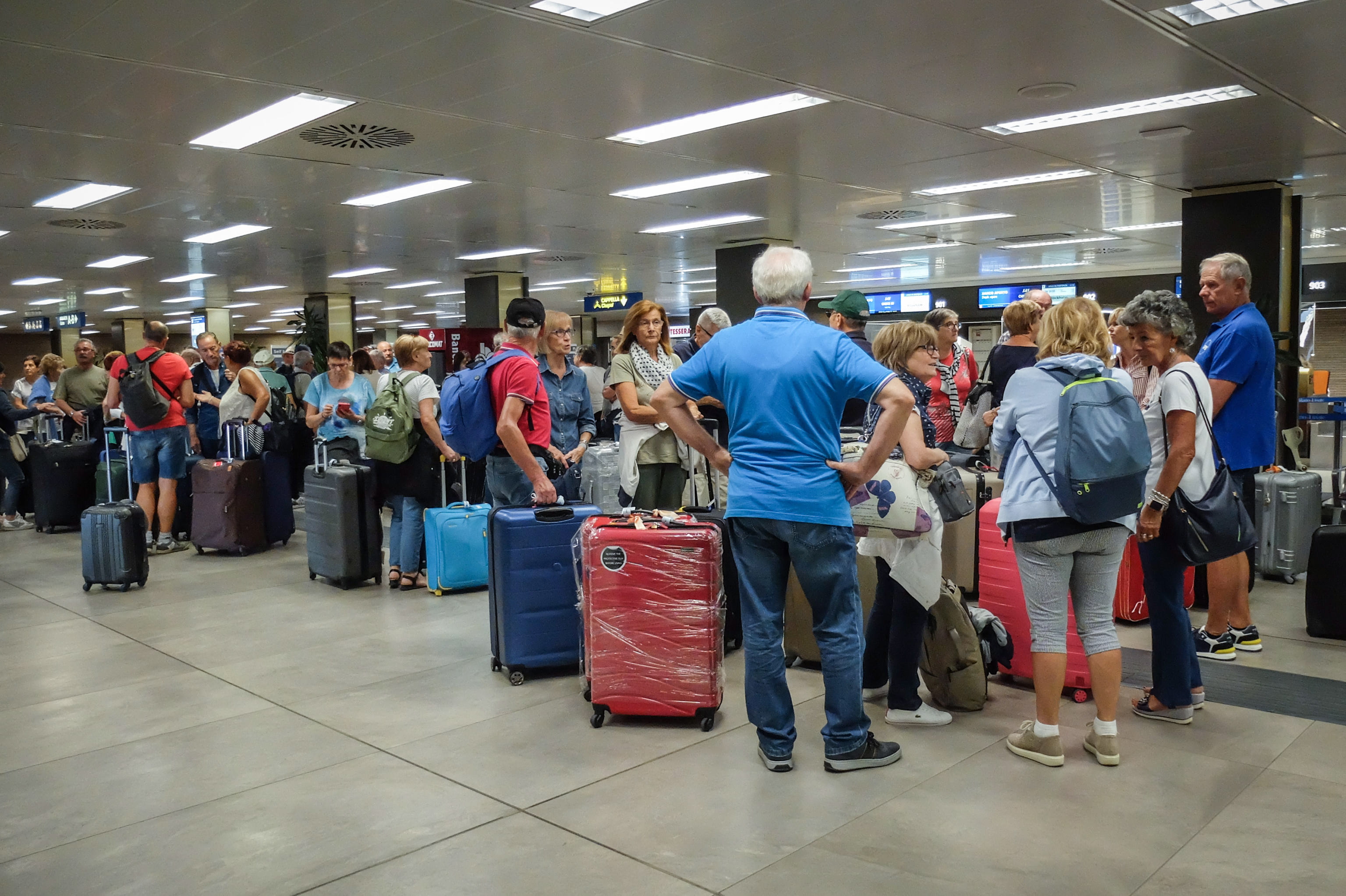 当地时间2023年9月8日,意大利米兰,机场工作人员举行24小时罢工要求提高工资,导致大量航班取消,旅客滞留在机场。