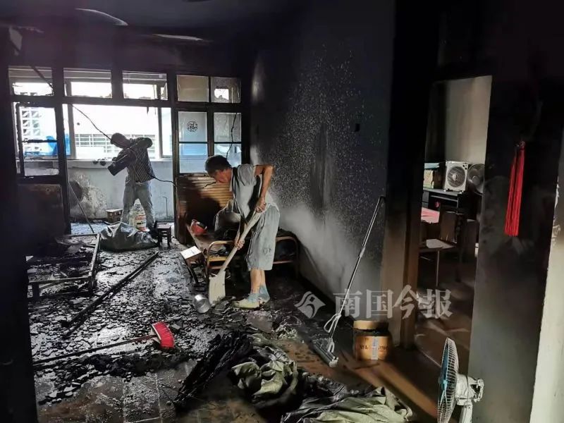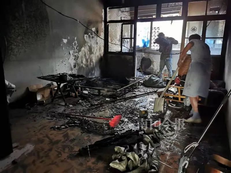 当天上午9时30分许,记者闻讯来到宏都新村,看到失火民房所在楼栋的单元步梯还是湿漉漉的,到处是消防灭火后留下的水渍。失火民房位于4楼,是一套两室一厅的老式住宅,防盗门在消防员救火时被撬开,已经显著变形,从门口望进去,可以看到被大火熏得漆黑的客厅墙面,以及地面上被烧得焦黑的各种杂物。