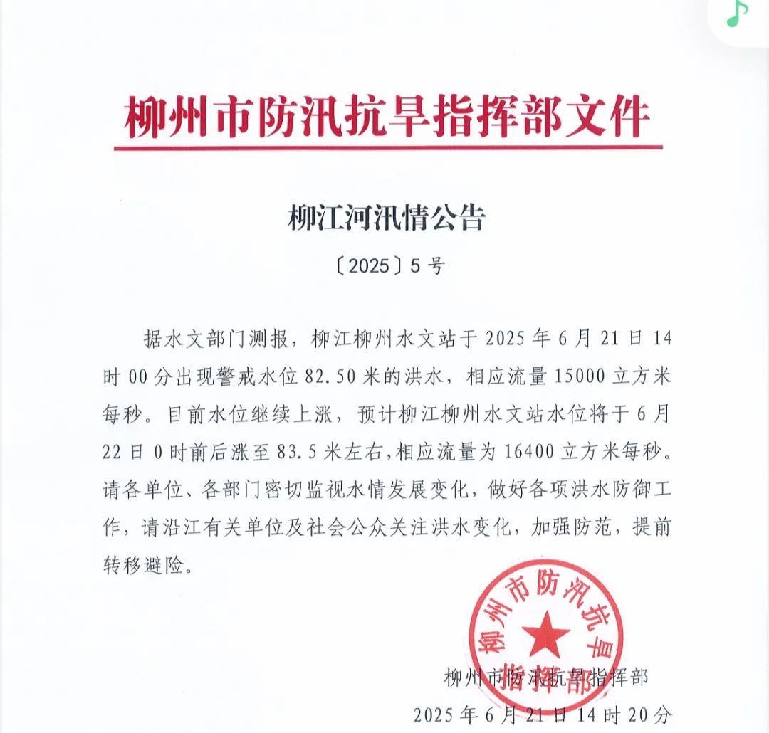 刚刚, 柳州市防汛抗旱指挥部发布柳江河汛情第5号公告:据水文部门测报,柳江柳州水文站于2025年6月21日14时00分出现警戒水位82.50米的洪水,相应流量15000立方米每秒。目前水位继续上涨,预计柳江柳州水文站水位将于6月22日0时前后涨至83.5米左右,相应流量为16400立方米每秒。请各单位、各部门密切监视水情发展变化,做好各项洪水防御工作,请沿江有关单位及社会公众关注洪水变化,加强防范,提前转移避险。