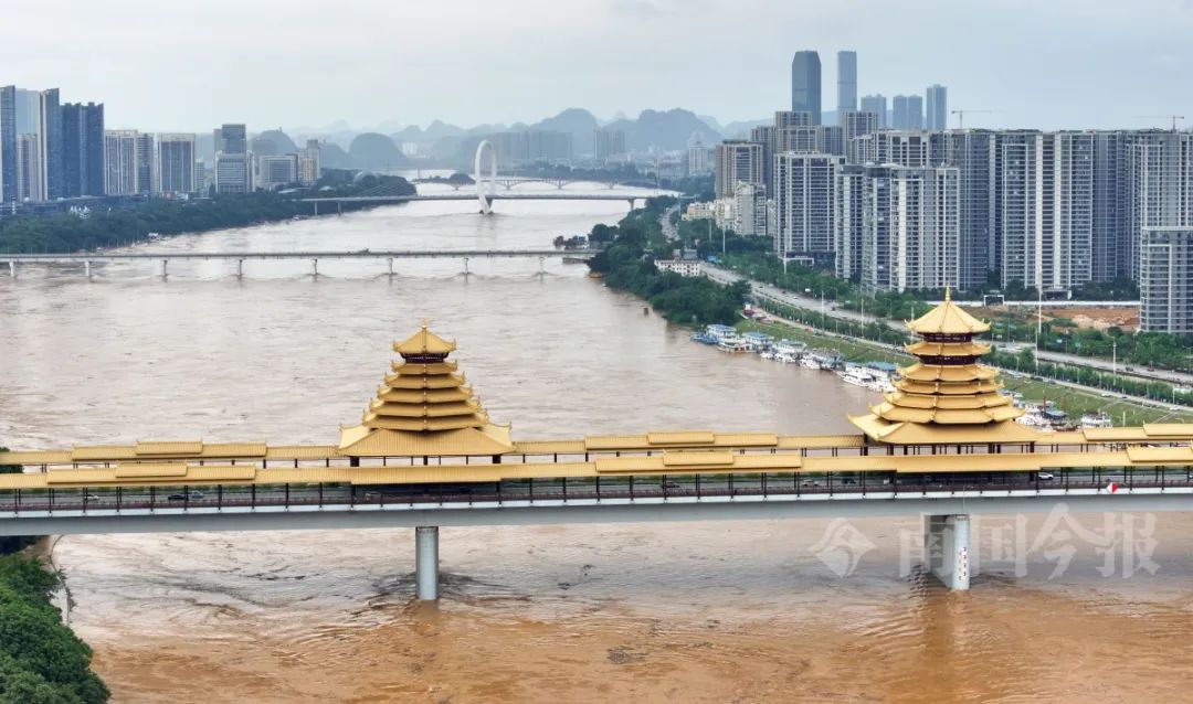 据柳州水文中心测报,柳江柳州水文站水位将于6月21日14时前后涨至警戒水位(82.5米),相应流量15000立方米每秒;6月22日0时前后涨至83.5米左右,相应流量16400立方米每秒。