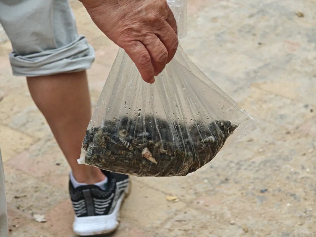 一袋被游客带走的蟹守螺,村民用于养蟹。