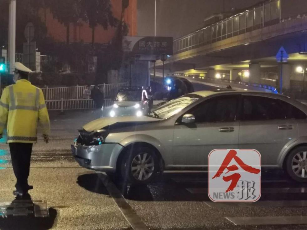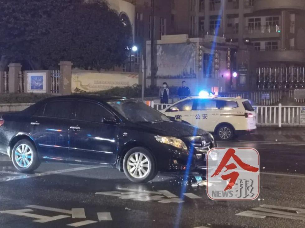 11日晚11时50分许,记者赶到事发现场。一辆黑色轿车停在北雀路红绿灯等待处,一辆灰色轿车对着黑色轿车车头前方逆向停着,相距约10米左右。两车的车头都有受损。灰色轿车引擎盖还变了形。