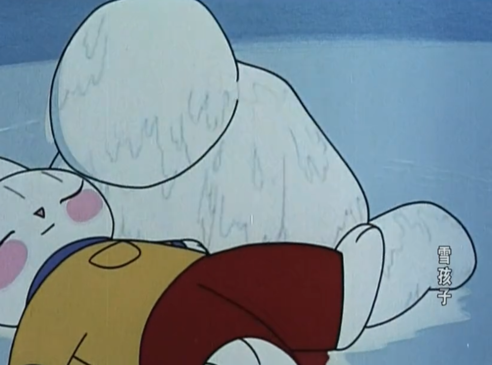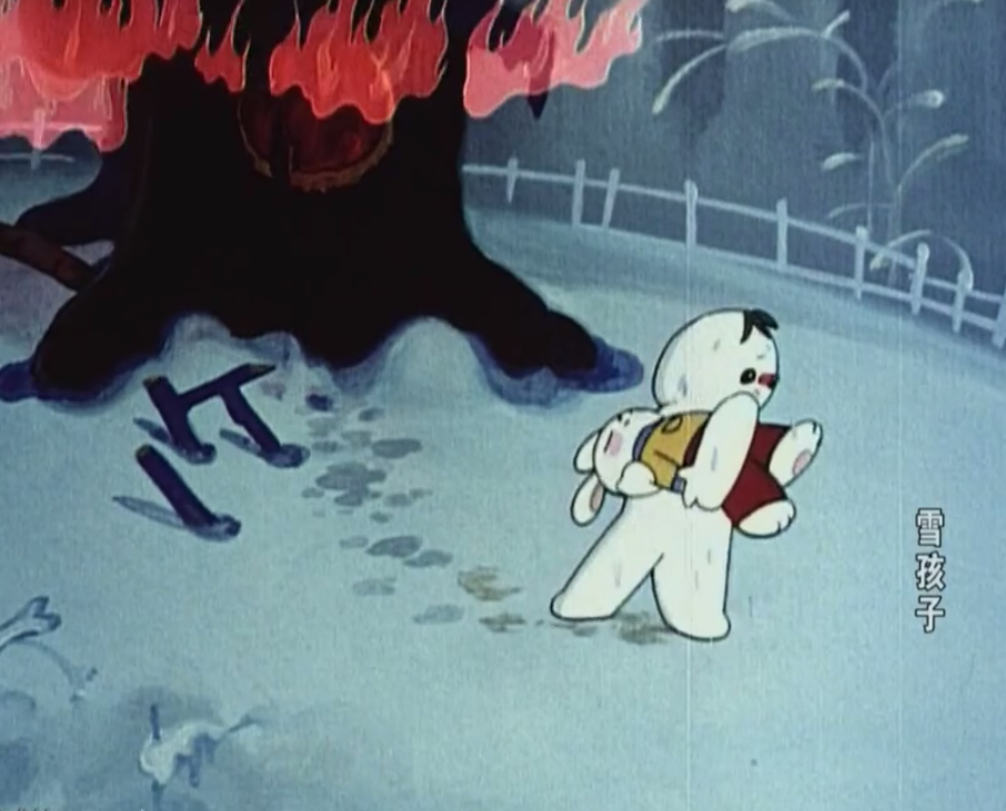 谈到这里,不得不提《雪孩子》。这部讲述友情与勇气的动画片,赚足了不少70、80后的眼泪。故事讲的是:白兔妈妈出门前给小白兔堆了个雪孩子陪他玩耍,后来小白兔睡着时着火了,雪孩子为救小白兔,奋不顾身地冲进了房子救出小白兔,自己却融化了。