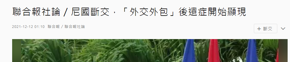 《联合报》发表社论称,蔡英文当局找美国当靠山,从大洋洲到拉丁美洲,台“邦交国”几乎主要都要靠美国稳住,“外包”当然是一条最简便的快捷方式,“然而一旦逆浪便无以前行,甚至可能翻船”。