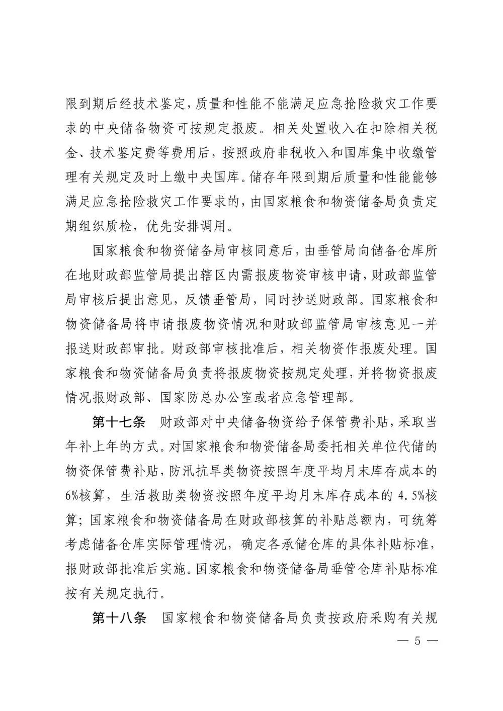 日前,国家粮食和物资储备局、应急管理部、财政部联合印发《中央应急抢险救灾物资储备管理暂行办法》。《暂行办法》共6章33条,分章对各方职责、储备购置、储备保管、物资调用、监督检查、责任追究等作了规定。
