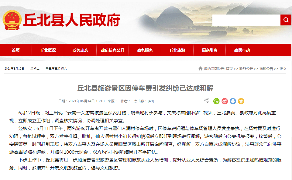 据云南省文山州丘北县政府网站6月14日消息,丘北县旅游景区因停车费引发的纠纷已达成和解。