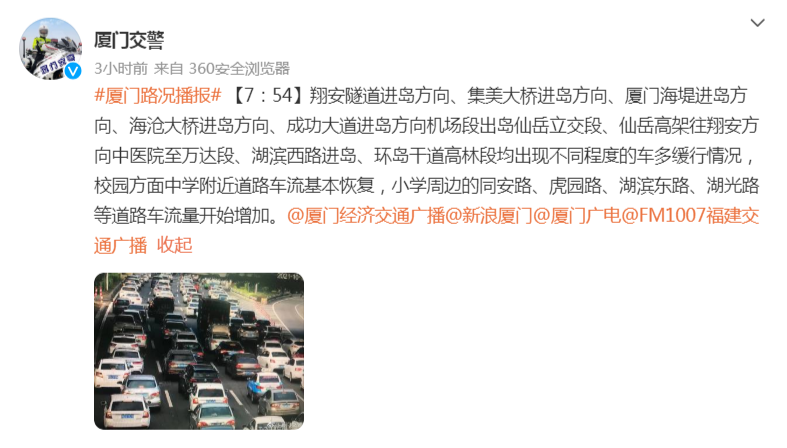 据@厦门交警,上午7时54分左右,翔安隧道进岛方向、集美大桥进岛方向、厦门海堤进岛方向、海沧大桥进岛方向、成功大道进岛方向机场段出岛仙岳立交段、仙岳高架往翔安方向中医院至万达段、湖滨西路进岛、环岛干道高林段均出现不同程度的车多缓行情况。