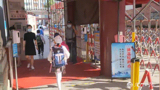 7时50分许,厦门五中小学部校门口,陆续有学生返校和入口的老师问好。同学们背着小书包、手拎饮水瓶和学习资料袋,自觉佩戴口罩,有序通过防护栏测温通道,依次进入校园。