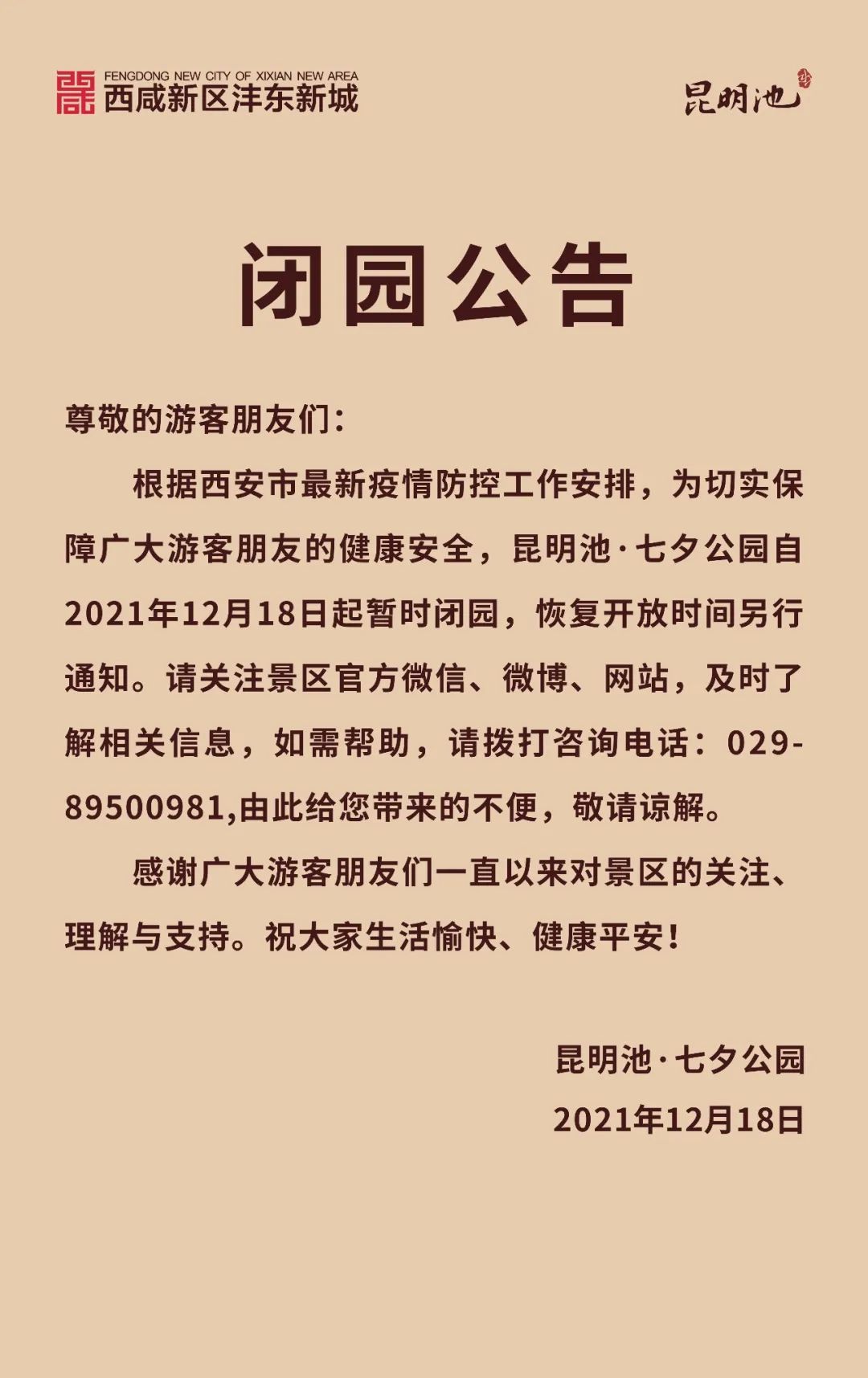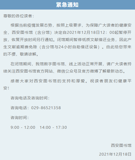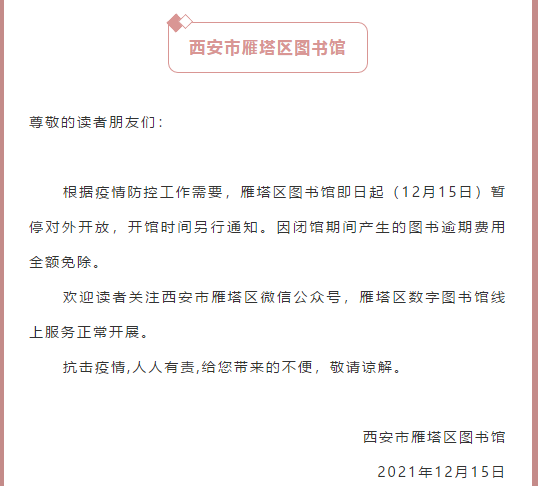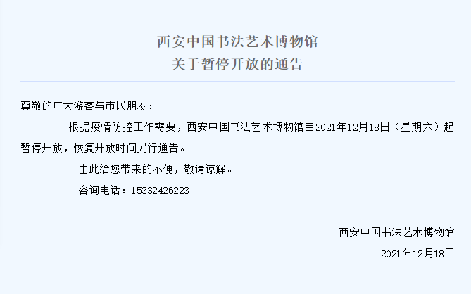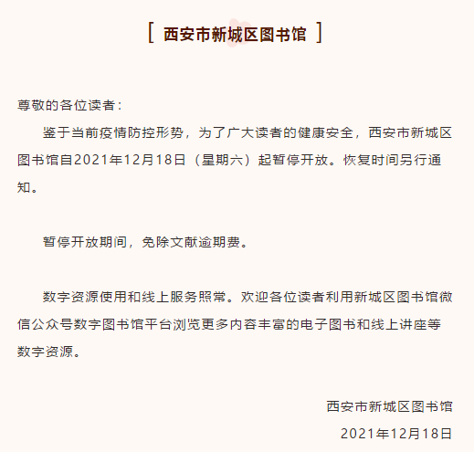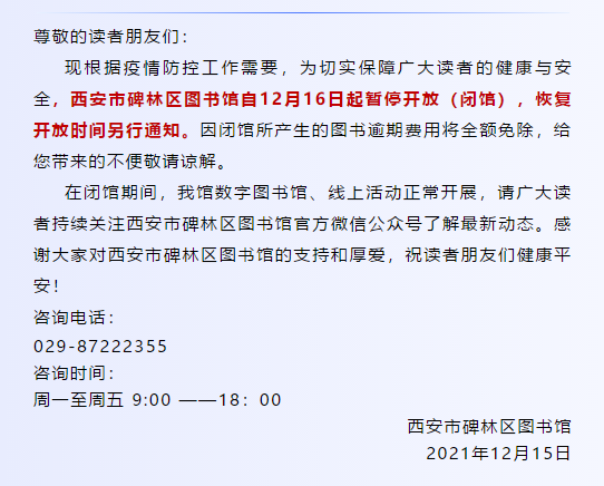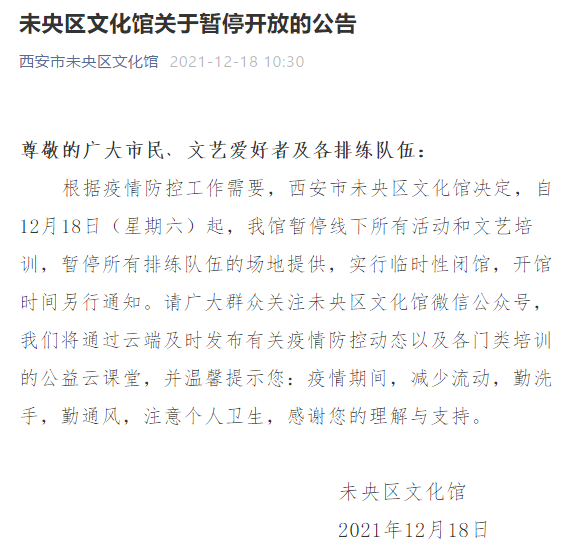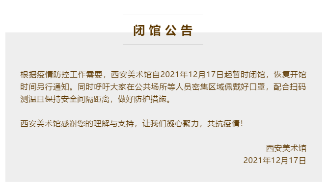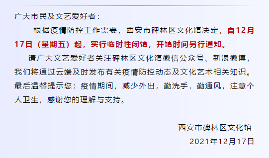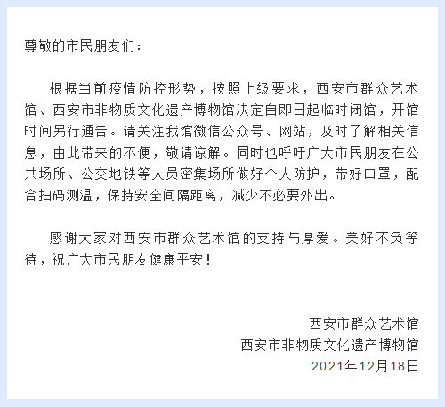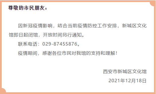 现根据疫情防控工作需要,西安群艺馆及各区县文化馆、西安市图书馆及各区县图书馆、西安美术馆等文化场馆暂时闭馆,恢复时间另行通知。