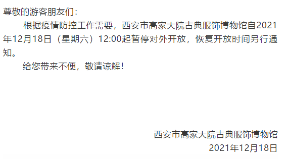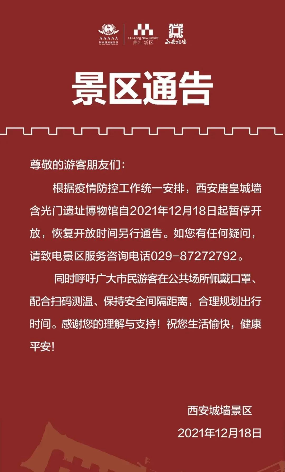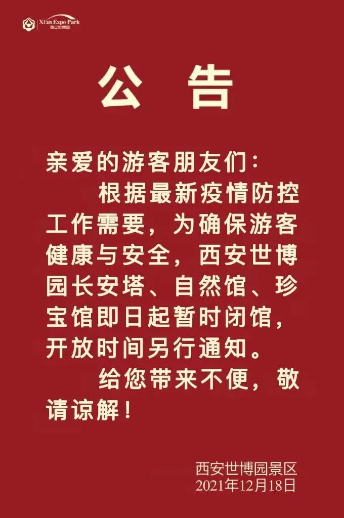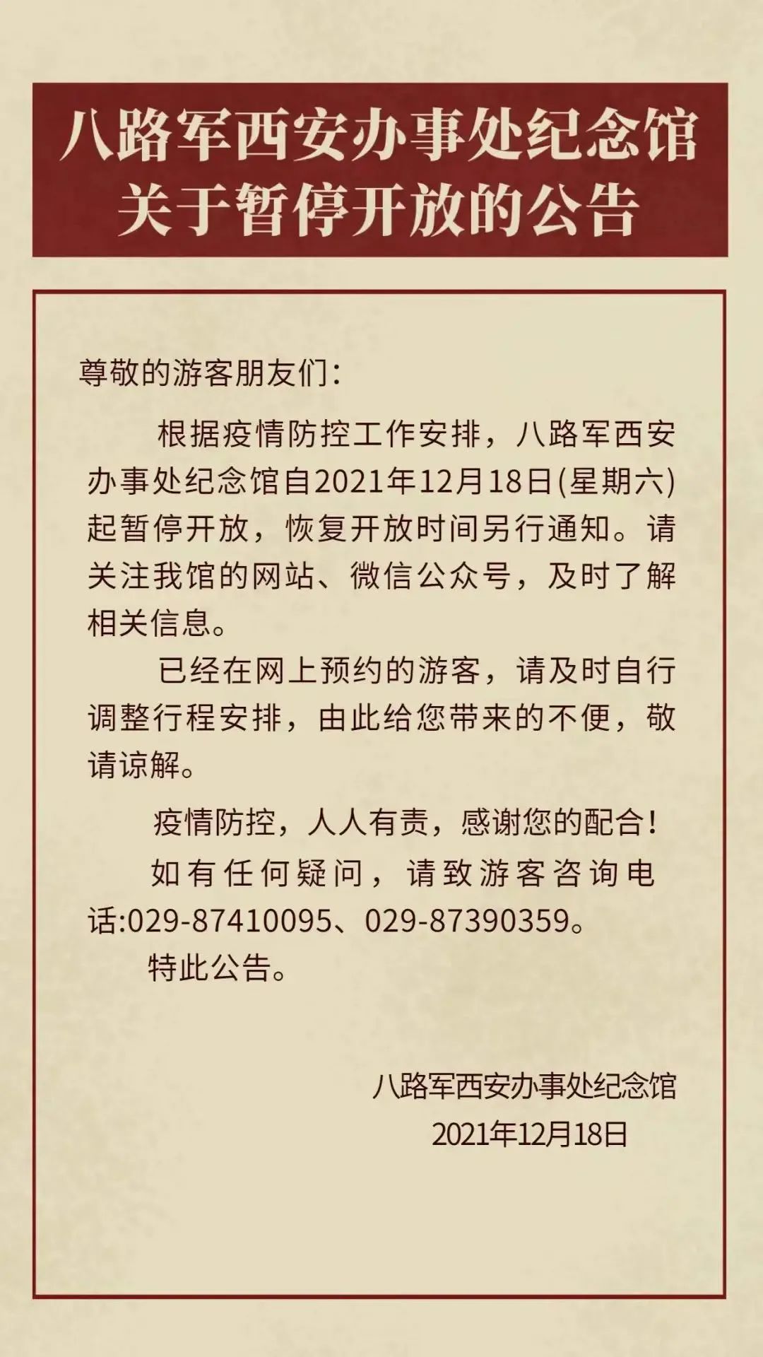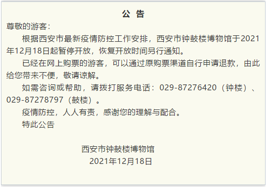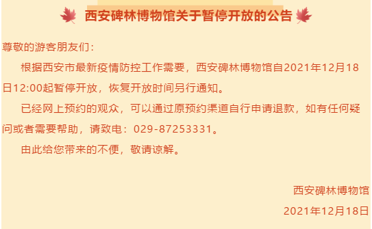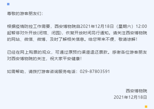 疫情当前,根据防疫工作要求,保障市民游客身体健康,西安各博物馆、纪念馆暂时闭馆,恢复时间另行通知。
