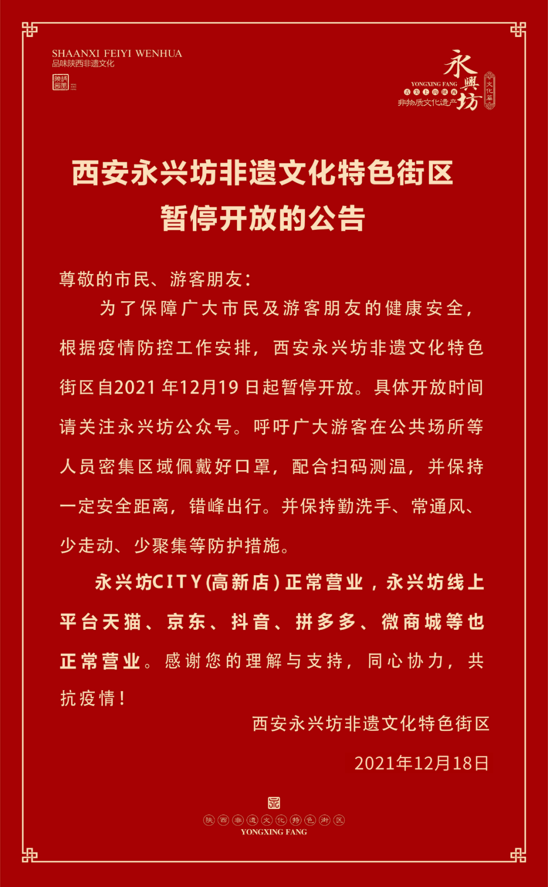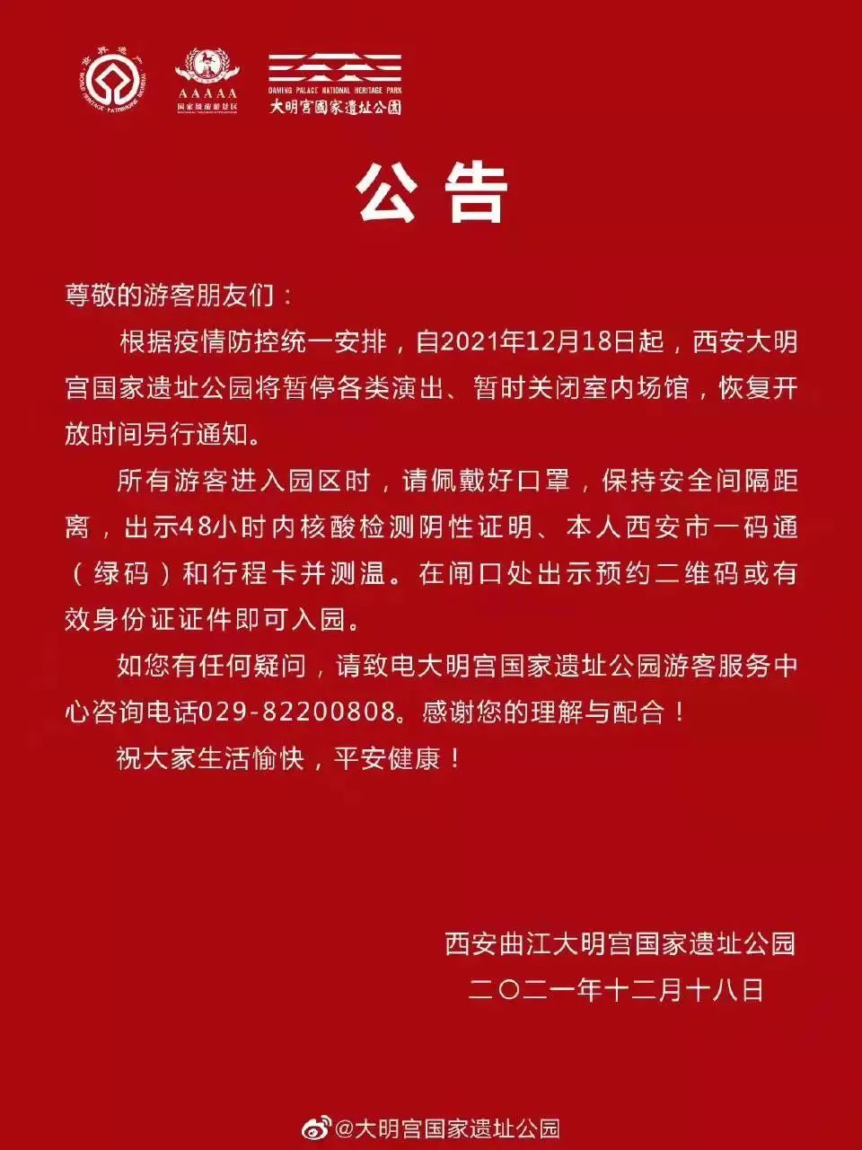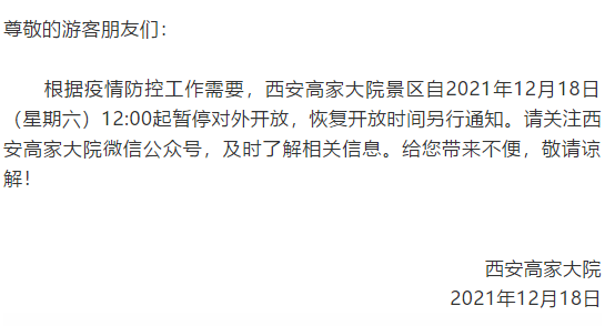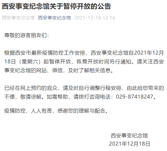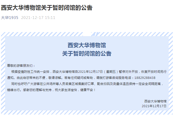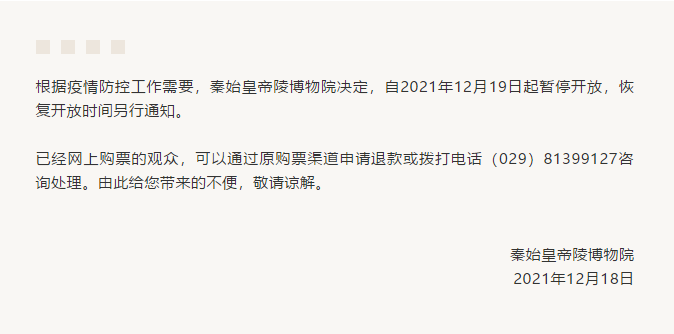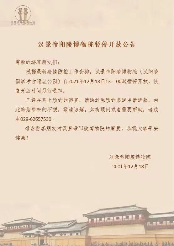 疫情当前,根据防疫工作要求,保障市民游客身体健康,西安各博物馆、纪念馆暂时闭馆,恢复时间另行通知。