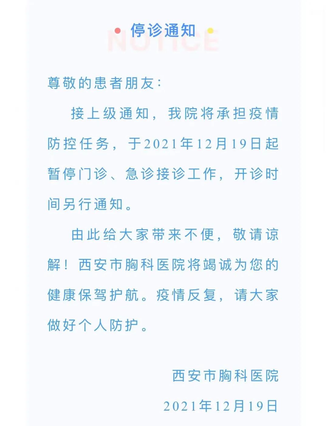 西安市胸科医院今天发布:医院将承担疫情防控任务,于12月19日起暂停门诊、急诊接诊工作,开诊时间另行通知。