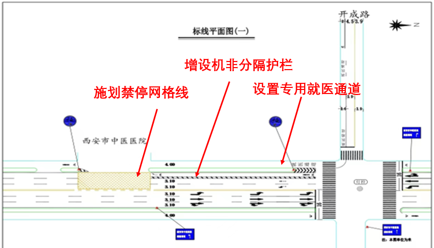 3、在雁塔西路交大一附院门前增设机非隔离护栏,设置就医专用通道;