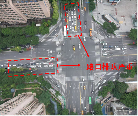 1、北进口与交叉口内部车道功能不一致,大量车辆进入交叉口频繁换道,导致交通秩序混乱,高峰时段排队较长;