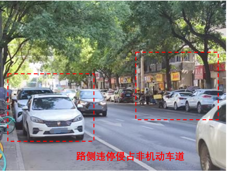 3、路边违停蹭停现象频发,导致机非混行严重,路段通行能力也因此受限。