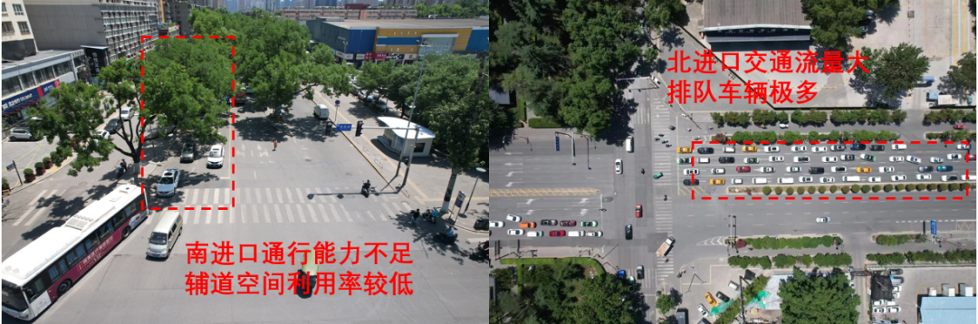 2、南进口辅道仅有非机动车通行,空间利用率不足;主路的2条机动车道通行能力有限。