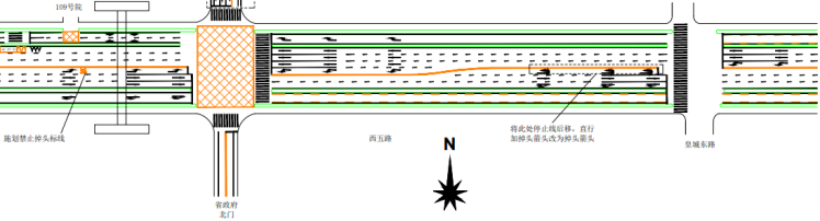 2、在西五路-皇城东路丁字西进口设置专用调头车道,并将掉头车道停止线适当后移,结合交通标志牌,引导驾驶人安全有序通过;