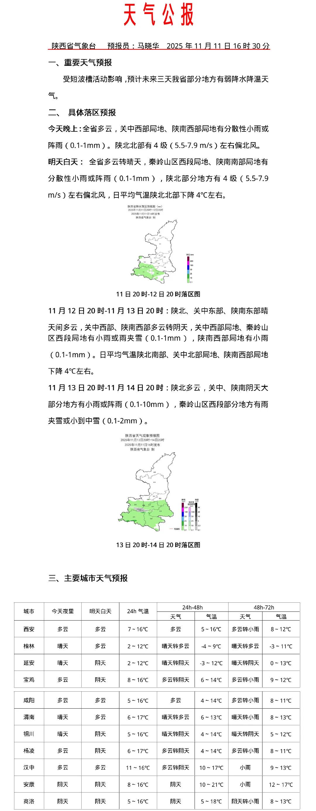 陕西气象台今天(11月11日)16时30分发布最新天气预报:受短波槽活动影响,预计未来三天我省部分地方有弱降水降温天气,具体预报如下: