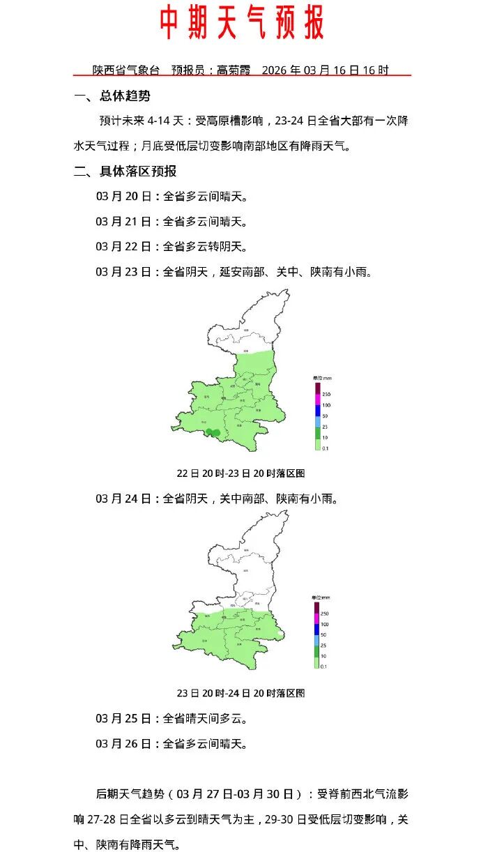 预计未来4-14天:受高原槽影响,23-24日全省大部有一次降水天气过程;月底受低层切变影响南部地区有降雨天气。