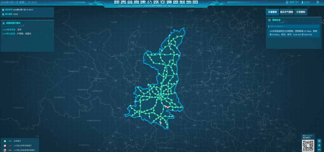 3.因施工,包茂高速西富段西安方向演池收费站至玉华宫服务区之间焦坪隧道K687+100至K688段占用超车道,玉华宫收费站入口西安方向临时管控。
