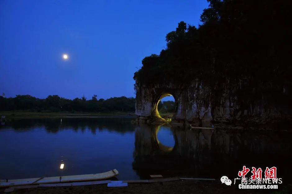 中秋月圆夜,象鼻山现“三月同辉”奇景。中新社发 唐梦宪 摄