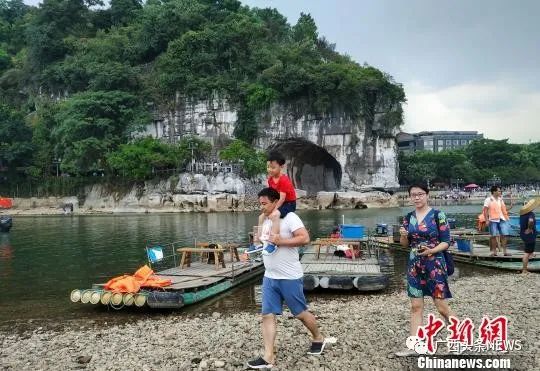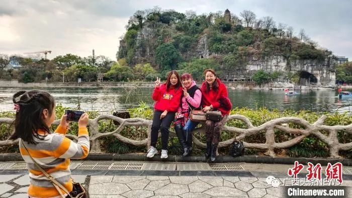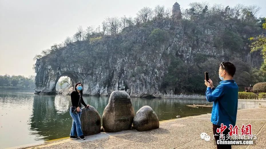 游客在象鼻山前拍照留念。中新社记者 欧惠兰 摄