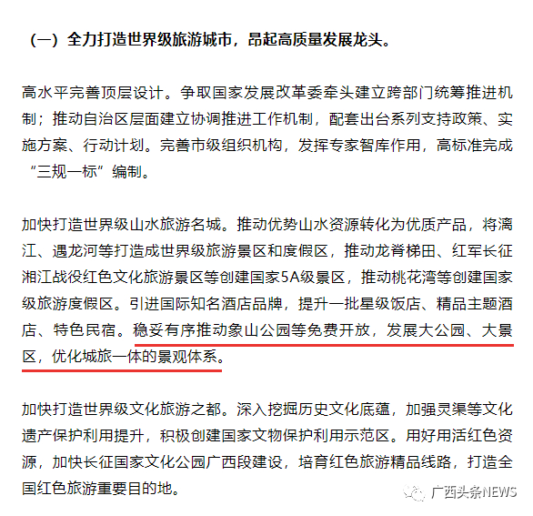 此前1月12日,在桂林市第六届人民代表大会第二次会议上,桂林市市长向大会作政府工作报告,提出2022年将稳妥有序推动象山公园等免费开放,发展大公园、大景区,优化城旅一体的景观体系。