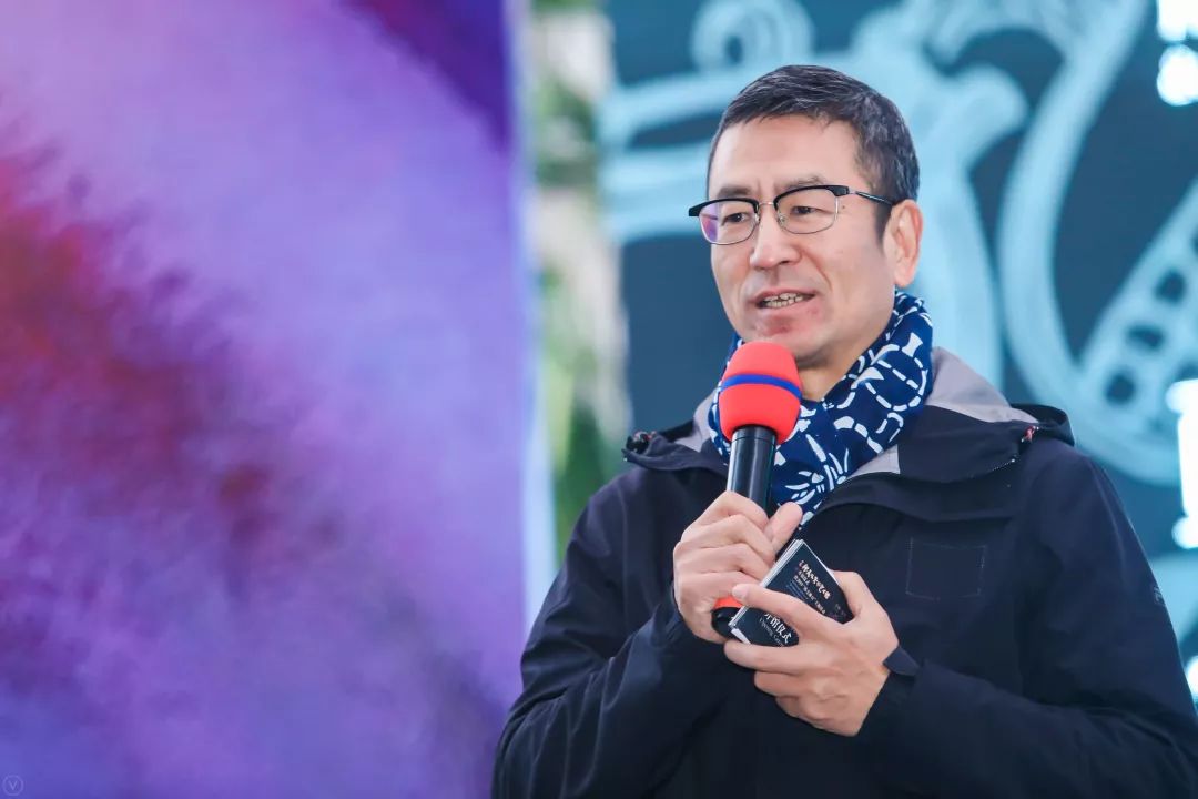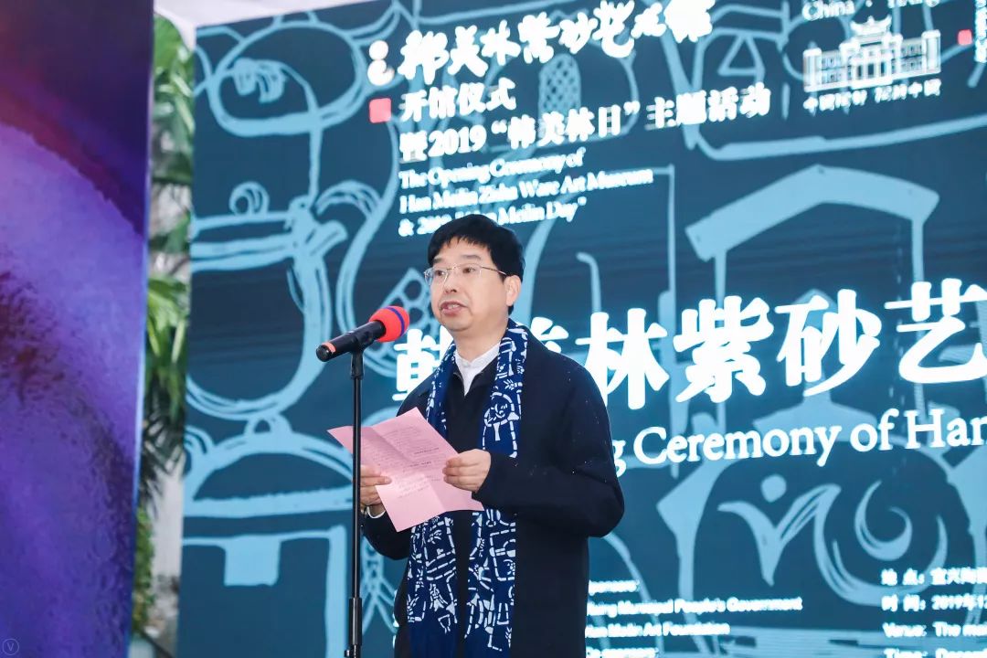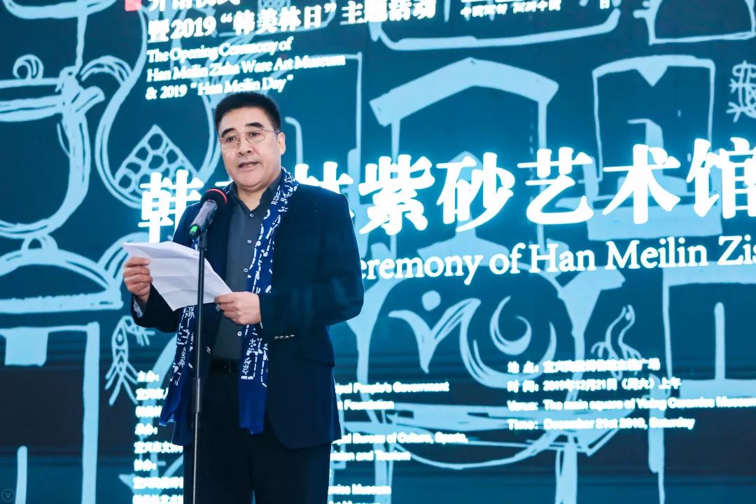 ▲杭州市人大党组副书记、副主任张建庭,北京市通州区副区长阳波,银川市副市长张全智,三地领导祝贺“韩美林紫砂艺术馆”开馆,宜兴市副市长储红飙上台接受祝福