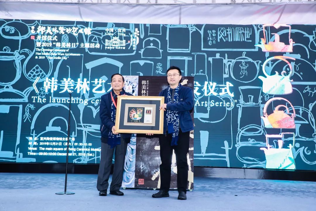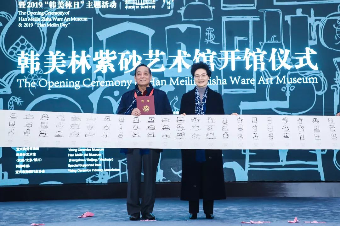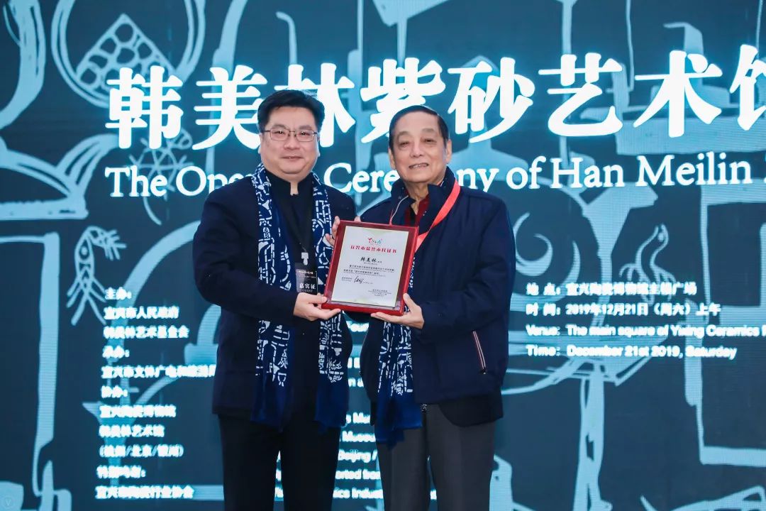 在开馆仪式上,韩美林将自己创作的500件艺术作品捐赠给宜兴市人民政府。为了表彰韩美林对宜兴紫砂艺术和文化教育方面的突出贡献,宜兴市人民政府现场授予韩美林“宜兴荣誉市民”称号。