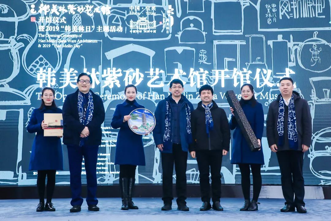 仪式最后,韩美林与宜兴市委书记沈建,无锡市委常委、宣传部部长袁飞,宜兴市人民政府市长张立军,宜兴市人大主任刘亚民,宜兴市政协主席梅中华,全国政协原副主席郑万通,原卫生部副部长、中国器官移植发展基金会理事长黄洁夫,全国政协常委、副秘书长,民进中央副主席朱永新,全国政协原副秘书长卢昌华,天津冯骥才文学艺术研究院院长冯骥才,当代文化学者、作家余秋雨,浙江省原省委常委、杭州原市委书记、杭州城市学研究理事会理事长王国平,北京市通州区人大常委会副主任刘卉,中国文联原副主席、党组副书记覃志刚,中国曲艺家协会主席姜昆,著名青年歌唱家李玉刚上台,携手启动开馆按钮,宣布“韩美林紫砂艺术馆”正式开馆。
