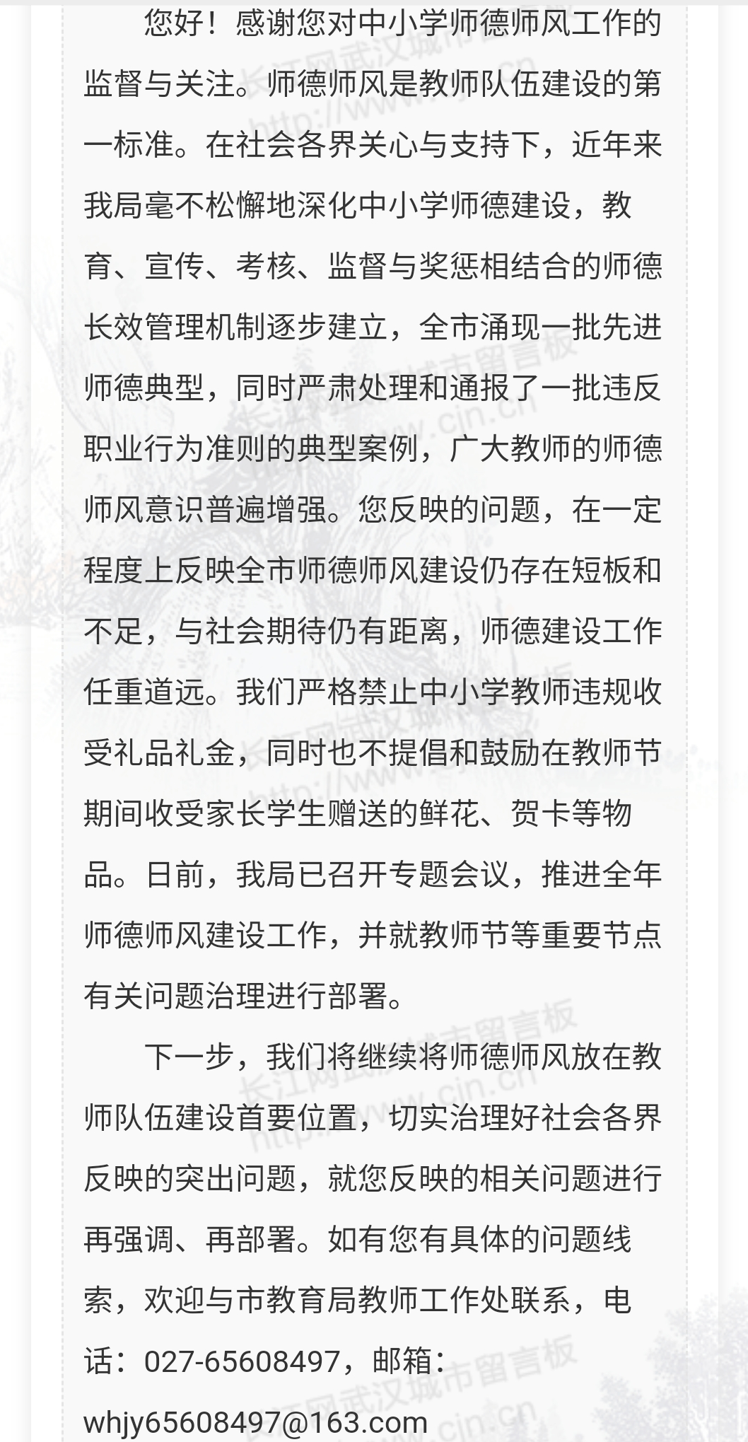 对此,武汉市教育局给出了官方答复:“近年来我局毫不松懈地深化中小学师德建设,教育、宣传、考核、监督与奖惩相结合的师德长效管理机制逐步建立……您反映的问题,在一定程度上反映全市师德师风建设仍存在短板和不足,与社会期待仍有距离,师德建设工作任重道远。我们严格禁止中小学教师违规收受礼品礼金,同时也不提倡和鼓励在教师节期间收受家长学生赠送的鲜花、贺卡等物品。日前,我局已召开专题会议,推进全年师德师风建设工作,并就教师节等重要节点有关问题治理进行部署。”
