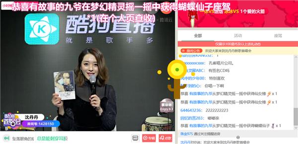 1月8号晚,实力唱将沈丹丹携最新单曲《坠落眼角的烟火》做客酷狗直播,不仅带来不插电音乐秀,还充分展现了自己的宠粉力,更是成为“追星赢家”与偶像雨宗林完成同台演唱!这场音乐盛宴吸引了近大批粉丝同时在线围观,各种礼物更是快要把屏幕都遮住了!