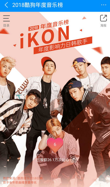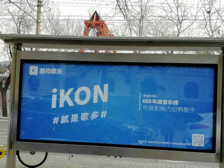 酷狗年度音乐榜上,iKON更夺得年度影响力日韩歌手,酷狗还专门投放了大量的公交站广告为iKON应援,获得比心数最高的歌手,更是能获得美国时代广场大屏一周推广!