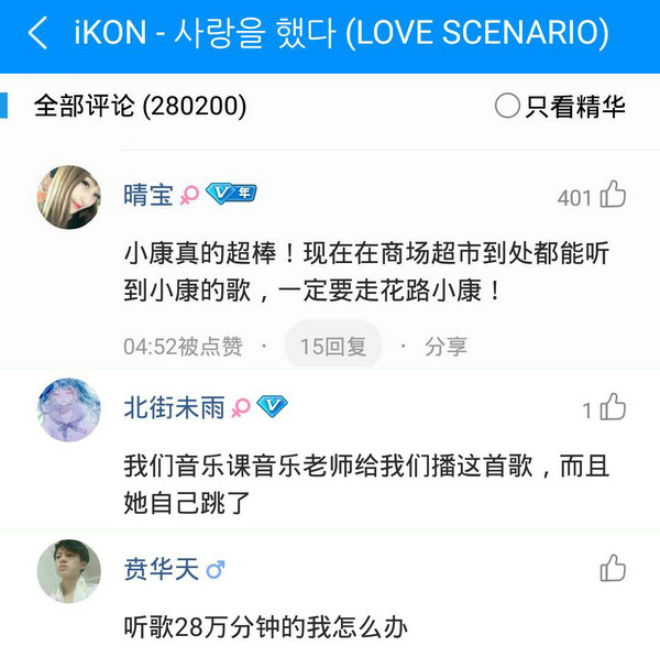 iKON,究竟有多火?2018年回归的第一首主打歌《love scenario》,登录酷狗不到1天就评论999+,而且一年过去热度不减反升,在酷狗音乐的评论区已经突破28万热评!不少酷狗网友更是笑称“音乐课老师自己播还自己跳了”、“听到28万分钟了~”而另一首主打曲《GOODBYE ROAD》亦登上过酷狗K-POP新歌榜单第一,可谓是高产与爆款的结合体。
