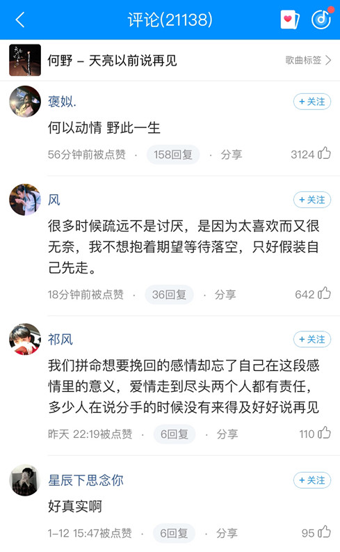 酷狗音乐上也有超过2.1万网友留言为何野打call!分手却“舍不得和你说再见”,只能“笑着泪流满面”,这种辛酸纠结的情感在何野的演绎中更显得“好真实啊”,也难怪引发那么多网友的共鸣,为何野呐喊:“何以动情,野此一生~”
