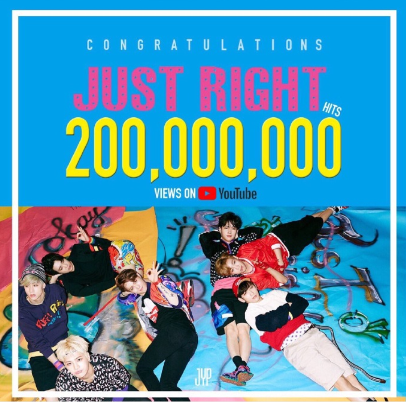 4月3日,GOT7于2015年7月13日发行的迷你三辑《Just Right》同名主打曲历时995天1小时17分钟在Youtube上的MV播放量突破两亿次,GOT7首支播放量破两亿MV诞生,也成为了第三组拥有MV YouTube点击量突破2亿的KPOP男团。