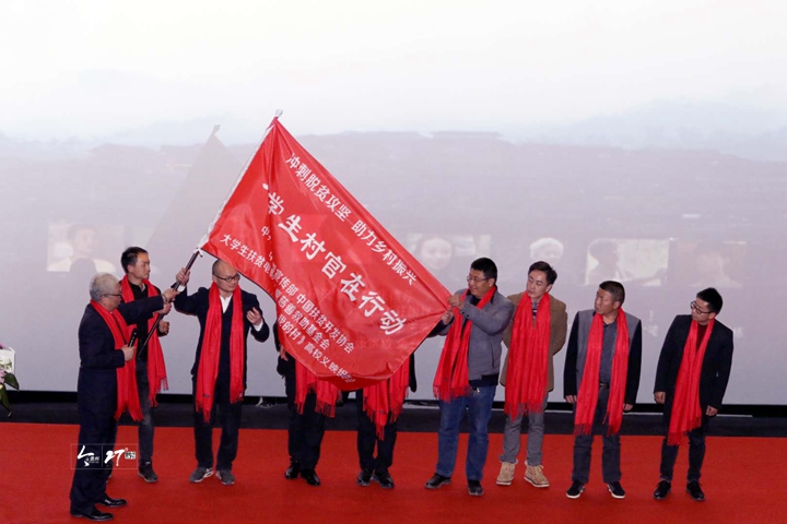 在首映礼现场,中国扶贫开发协会副会长何俊才宣布大学生村官扶贫电影《这一站•我的村》全国高校公益巡回放映仪式正式启动,并为贵州省大学代表举行了“冲剌脱贫攻坚,助力乡村振兴”大学生村官在行动的授旗仪式。