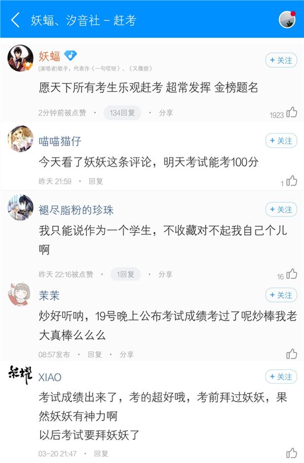 古风少年妖蝠更现身酷狗评论区,一句“乐观赶考”就收获了近2000个赞,考生歌迷们纷纷留言称“以后考试拜妖妖”、“必须收藏”、“明天考试100分”。
