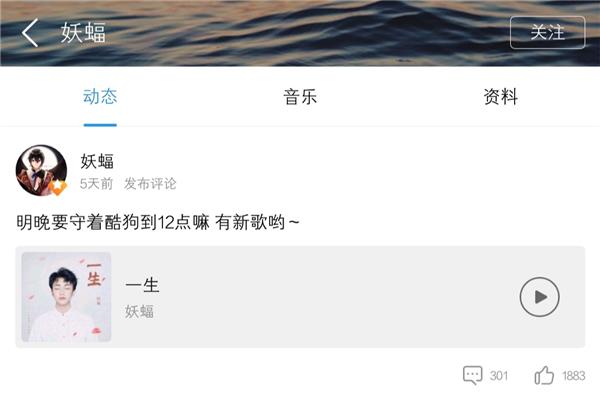 古风少年妖蝠已入驻酷狗音乐,粉丝们记得关注他的酷狗个人主页,不仅能第一时间收听新歌,还有机会与音乐人在线互动哦!