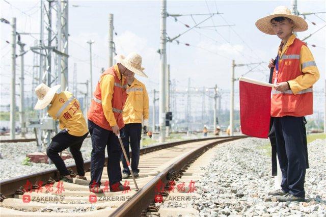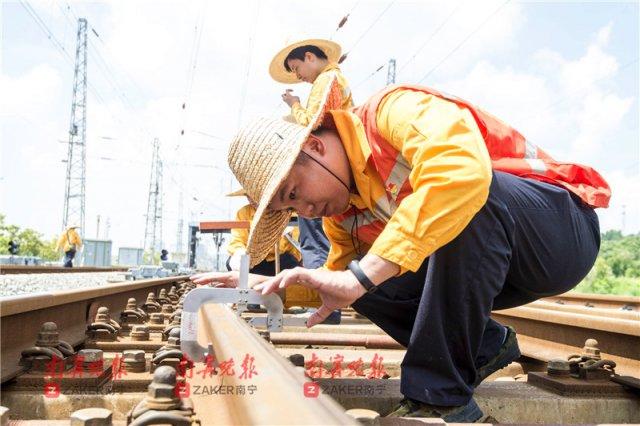 南宁工务段南宁东高铁车间党总支书记陆恨冰介绍,南宁动车所巡检班负责南宁动车所内 26 公里钢轨、110 组道岔的巡检工作。由于动车所白天出车、晚上检修的工作性质,巡检班工作时间与其他高铁工务专业夜间作业的情况不同,只能利用每天上午最后一列动车出库后、下午第一列动车入库前的时间进行检修作业,是南宁工务段唯一一个必须在白天高温时段作业的线路检修班组。这时段正是一天中气温最高的时段,尤其是在 7、8 月份,白天气温高达 36 摄氏度,加上动车所内的线路不允许有任何遮挡物,每天,线路工们要带着班组的人顶着 46 的地表温度,在 56 度的钢轨上工作 5 个小时。