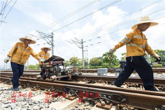 每天上午 10 时许,当最后一趟动车驶出屯里动车所后,巡检工、维修工开始进入动车所及至南宁东站的线路巡检,在下午 5 时左右当第一趟动车完成一天任务驶回动车所,巡检必须完工,这时段内,正是一天中气温最高的时段,加上动车所内的线路不允许有任何遮挡物,地表温度达 46°C,铁轨 56°C,巡检工、维修工就在这样的环境下作业。8 月 6 日,记者前往南宁屯里动车所至南宁东站间,体验巡检工的高温作业。